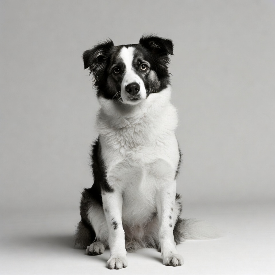 A black and white Border Collie dog sits attentively on a plain gray background. The dog has fluffy fur with distinctive white markings on its face, chest, paws, and tail tip. Its ears are perked up and it gazes directly at the camera.