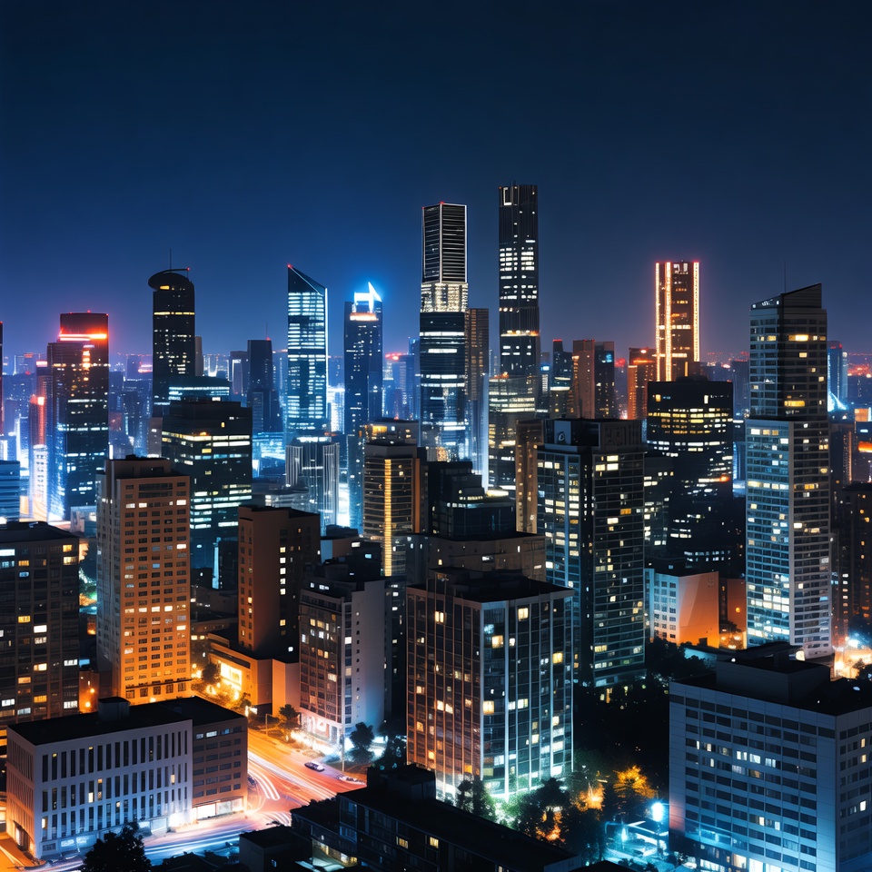aerial view, blue lights, bustling city, city at night, city lights, dark sky, glowing buildings, high-rise buildings, illuminated towers, metropolis, modern architecture, neon lights, night cityscape, night view, orange lights, red lights, skyline panorama, skyscrapers, urban landscape, Shanghai skyline