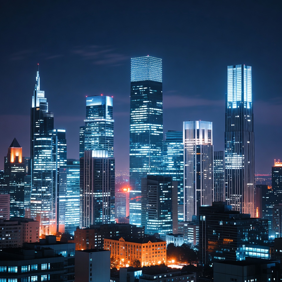 aerial view, architecture, blue lights, cityscape, cloudy sky, dark sky, downtown, glowing skyline, high-rise, illuminated buildings, metropolis, modern buildings, neon lights, night city, night view, orange glow, skyscrapers, tall towers, urban landscape, vibrant lights, city skyline