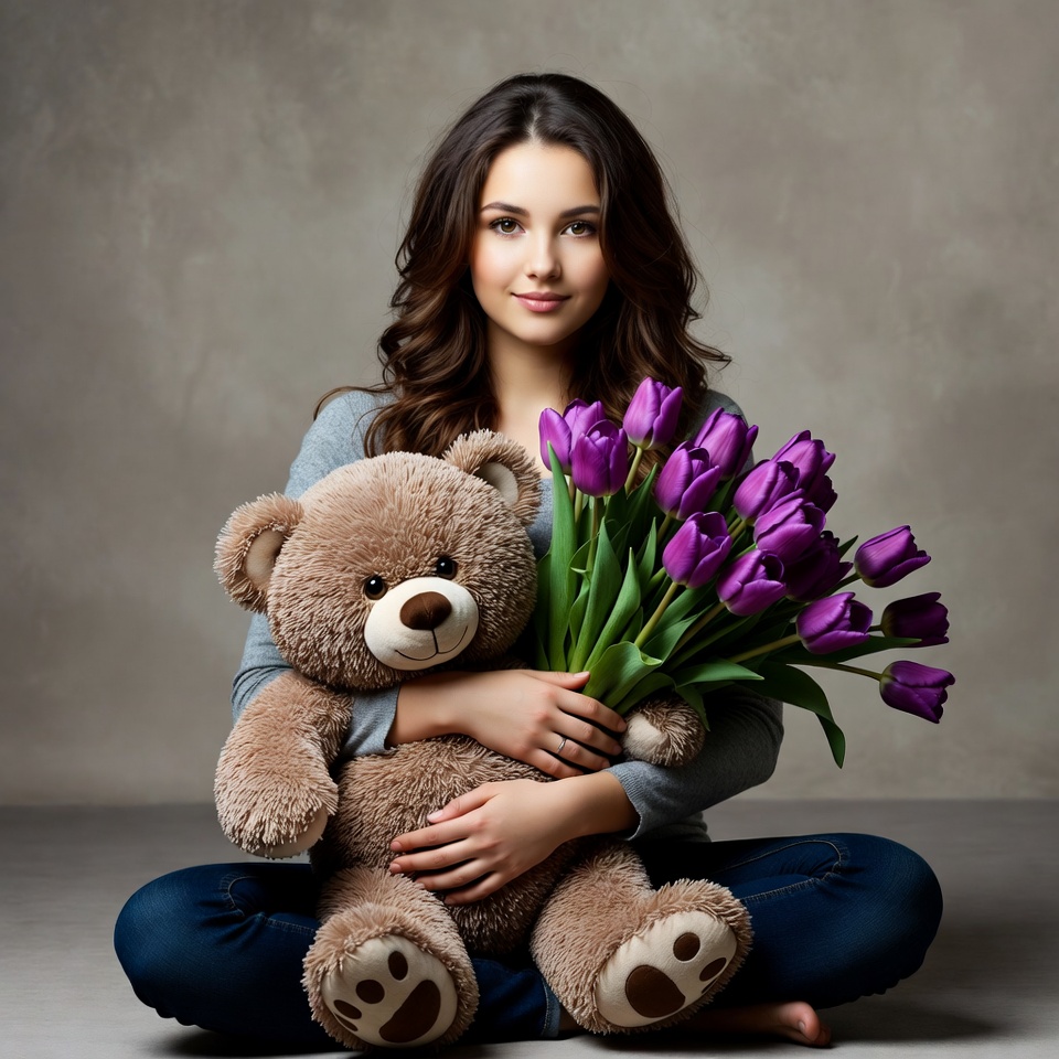 A young woman with long brown wavy hair sits on the floor holding a large brown teddy bear and a vibrant bouquet of purple tulips. She wears a gray sweater and blue jeans, smiling gently at the camera. The scene is set against a neutral gray background.