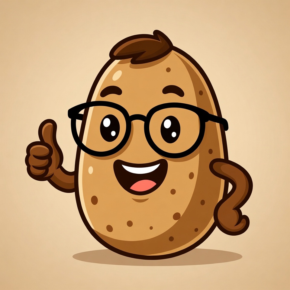 A cute cartoon potato character with brown hair, round glasses, and a big smile gives a thumbs up gesture. It has large expressive eyes and brown arms posed confidently. The illustration features a simple isolated beige background.