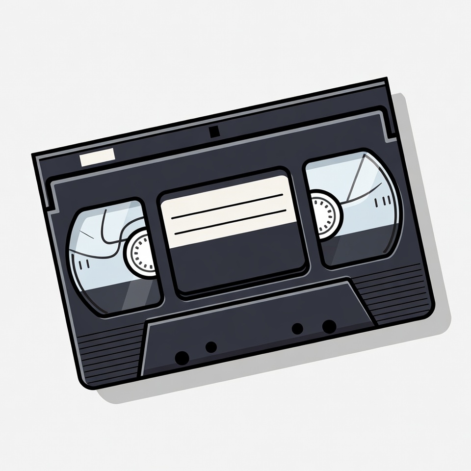 A black VHS cassette tape is illustrated with a slight tilt on a white background. It features two transparent windows showing white spools inside and a black label area on top. The design uses clean line art with subtle shadows for a 3D effect.