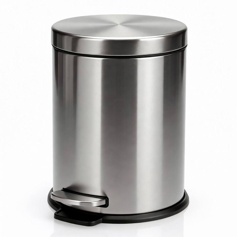 bathroom bin, black pedal, container, cylindrical, foot pedal, garbage bin, household, isolated background, kitchen trash, metal bin, modern, pedal bin, rubbish bin, shiny metal, silver, stainless steel, step trash, wastebasket, white background, trash can