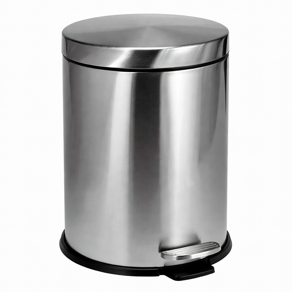 bathroom bin, black base, cylindrical bin, foot pedal, garbage can, household waste, isolated background, kitchen bin, metal trashcan, office trash, shiny metal, stainless steel, step pedal, waste bin, trash can