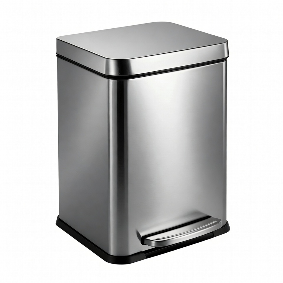 bathroom bin, brushed steel, compact bin, flip lid, foot pedal, garbage bin, household waste, isolated background, kitchen trash, metal trashcan, modern design, pedal bin, recycling bin, shiny finish, silver trash, square bin, stainless steel, step trash can, wastebasket, trash can