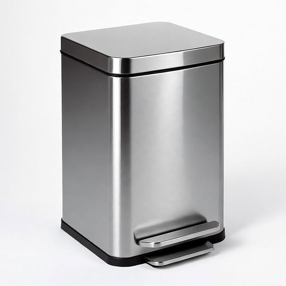 bathroom bin, brushed steel, foot pedal, garbage bin, isolated background, kitchen trash, metal trash can, modern design, pedal trash can, recycling bin, shiny metal, square bin, stainless steel, step trash, waste bin, trash can