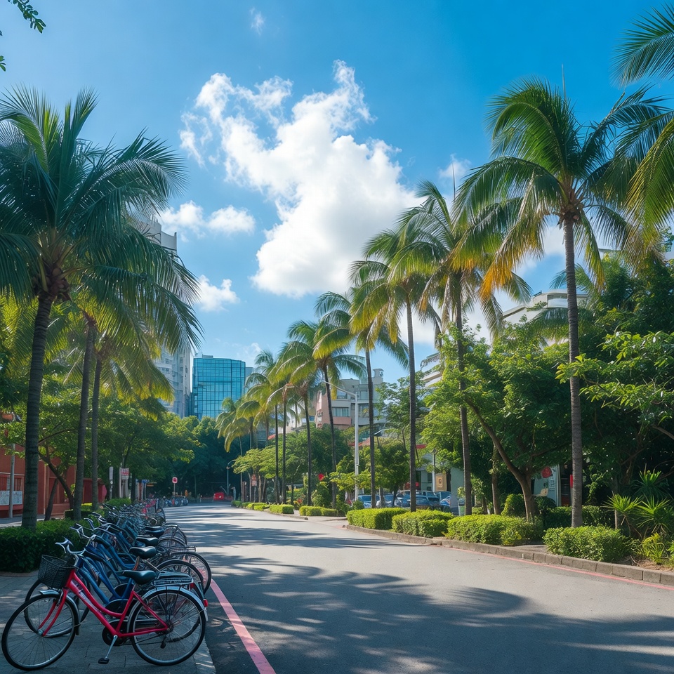 avenue, bicycles, bike parking, blue bikes, blue sky, boulevard, city street, clear weather, green shrubs, greenery, high-rise buildings, lined trees, modern architecture, outdoor scene, palm trees, parked cars, red bikes, rental bikes, sunny day, sunshine, tropical city, tropical street, urban landscape, white clouds, palm trees