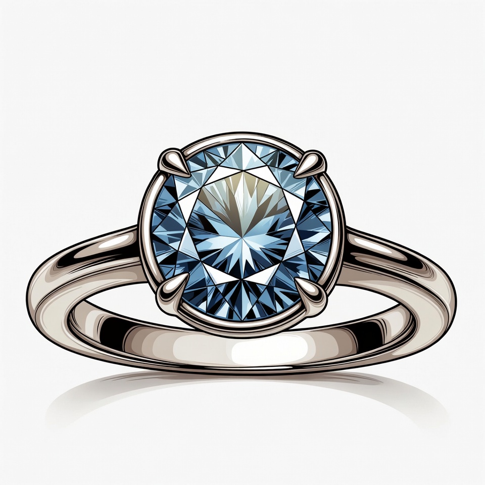 A detailed illustration of a solitaire engagement ring features a large, sparkling blue diamond set in a prong setting. The ring band is polished silver with subtle shine and shadow effects. It is centered on a transparent background with a soft reflection beneath.