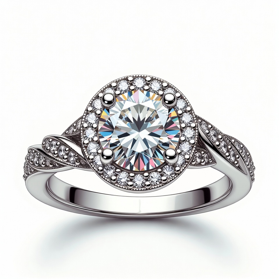 bridal ring, closeup ring, diamond accents, diamond halo, diamond ring, elegant ring, fine jewelry, gemstone, halo ring, jewelry, jewelry design, luxury jewelry, ring design, round diamond, silver ring, solitaire diamond, twisted band, wedding ring, white gold ring, engagement ring