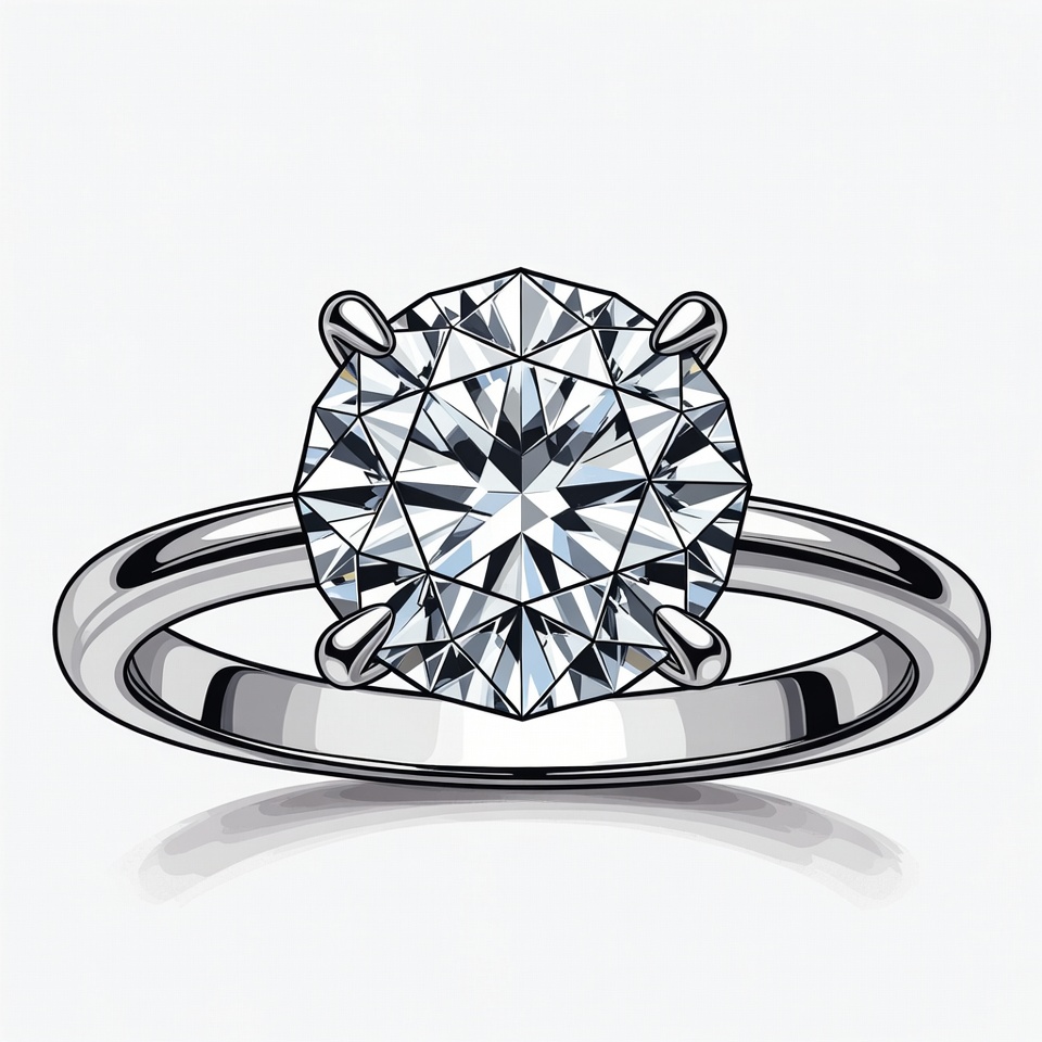 A detailed illustration of a solitaire diamond engagement ring on an isolated white background. The large round brilliant-cut diamond is set in a prong setting on a shiny silver band. A subtle reflection appears beneath the ring.
