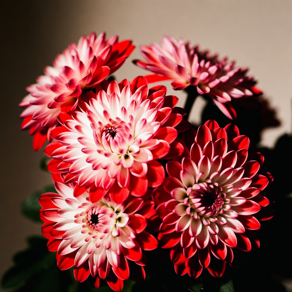 A vibrant bouquet of dahlia flowers features red and white petals with intricate fringed edges. The flowers are clustered together on green stems against a blurred beige background. Soft lighting highlights the detailed centers and layered blooms.