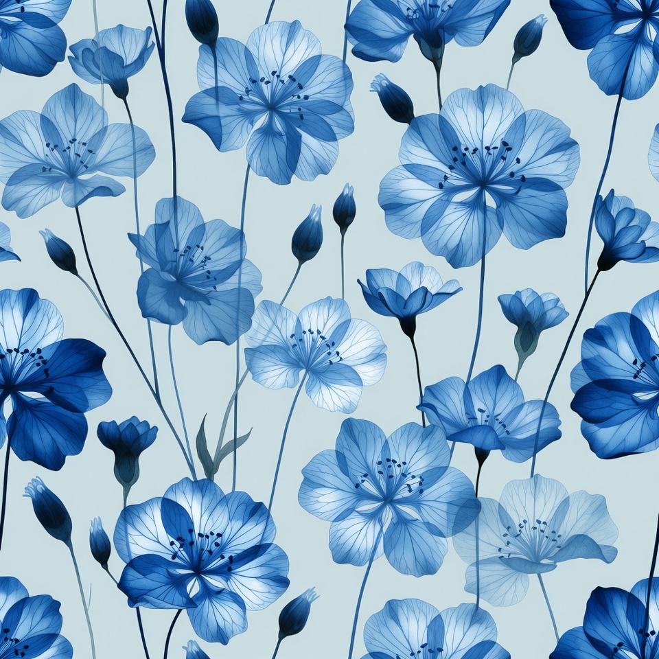 A seamless pattern features numerous blue flowers with delicate petals and thin stems on a light gray background. The flowers have a translucent, watercolor-like appearance with varying sizes and orientations. Buds and leaves add detail to the repeating floral design.