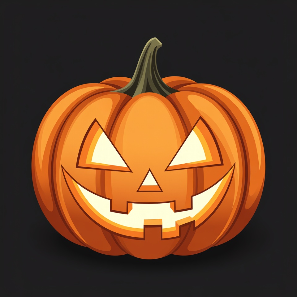 A carved orange pumpkin with glowing yellow eyes, nose, and jagged smiling mouth forms a classic jack-o'-lantern face. It has a green stem on top and sits on a solid black background. The illustration features smooth shading and bright highlights for a festive Halloween look.