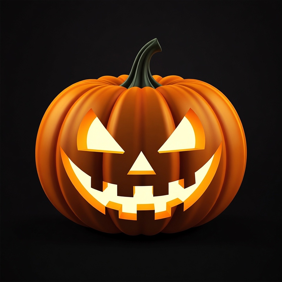 A carved orange pumpkin with glowing yellow eyes, triangular nose, and jagged smiling mouth forms a classic jack-o'-lantern face. It has a green stem on top and sits isolated against a solid black background. The illustration features smooth 3D rendering with bright light effects from the carved openings.