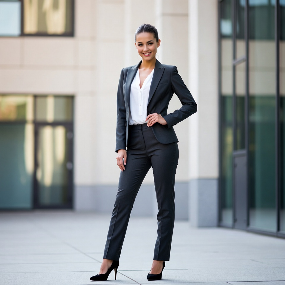 A smiling woman with dark hair in a ponytail stands confidently in front of a modern glass building. She wears a tailored black blazer, white blouse, matching pants, and black high heels, with one hand on her hip. The urban outdoor setting features beige stone architecture and large windows.