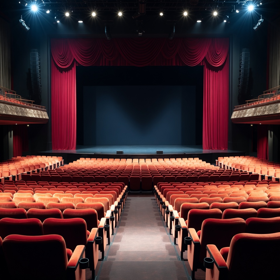 aisle, architecture, auditorium, balcony seats, curtains, dark stage, empty auditorium, empty stage, empty theater, grand theater, interior, opera house, performance hall, performing arts, red curtains, red seats, red velvet, spotlights, stage, stage lights, theater seats, theatre, velvet seats, venue, theater