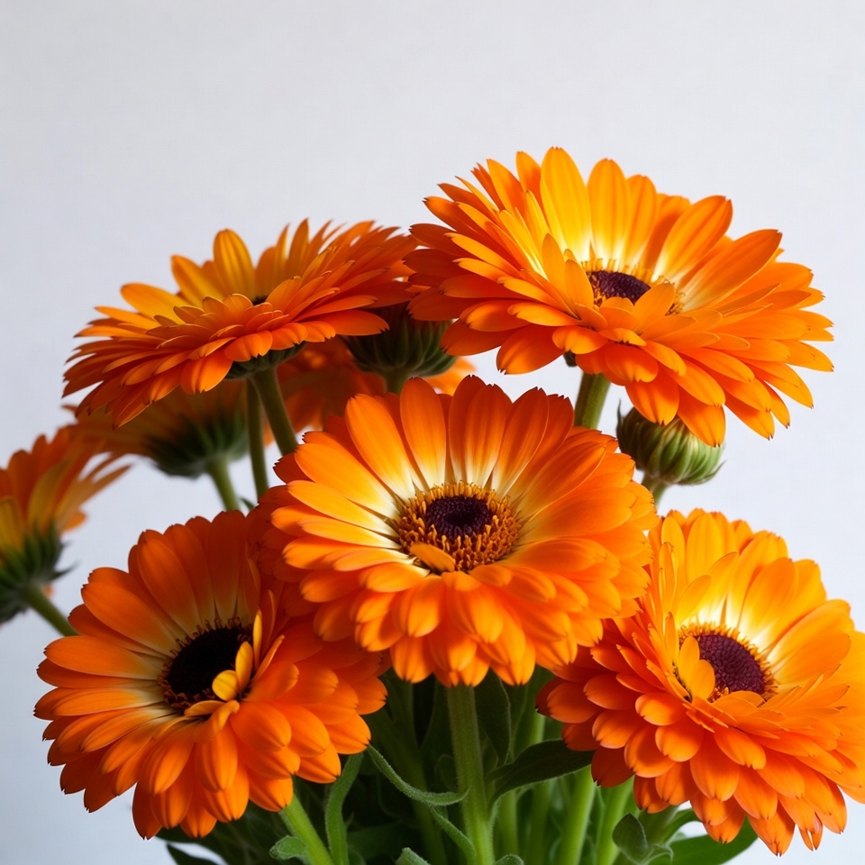 A vibrant bouquet of orange gerbera daisies with bright petals and dark centers is arranged together. The flowers feature green stems and buds, set against a plain white background. The composition highlights the vivid orange blooms in a clustered display.