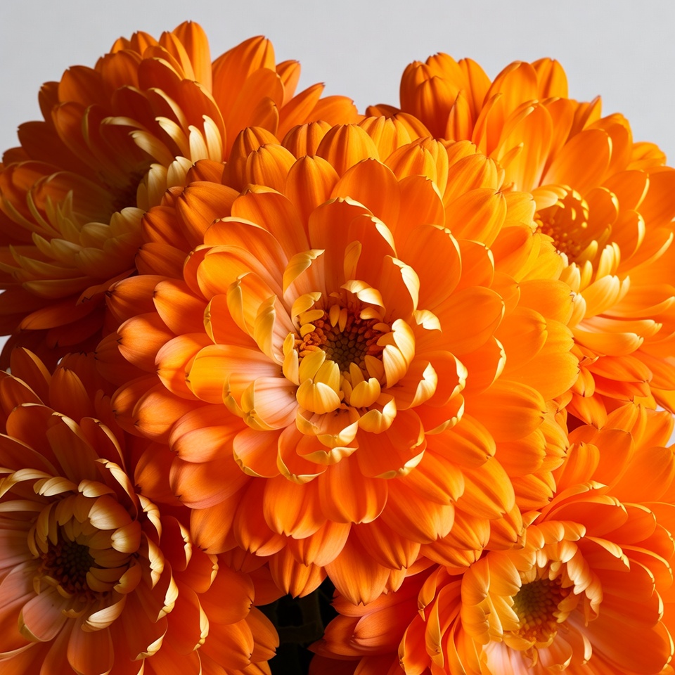 bouquet, bright orange, close-up flowers, daisy blooms, floral arrangement, flower bunch, flower cluster, garden flowers, gerbera daisies, orange petals, petal layers, vibrant flowers, white background, yellow centers, orange flowers