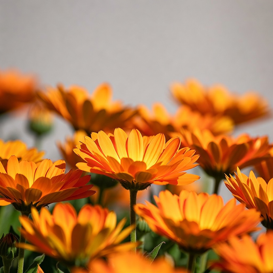 A cluster of vibrant orange marigold flowers fills the frame in a close-up shot. The flowers feature layered petals and green stems against a soft gray blurred background. Sunlight highlights the bright orange blooms.