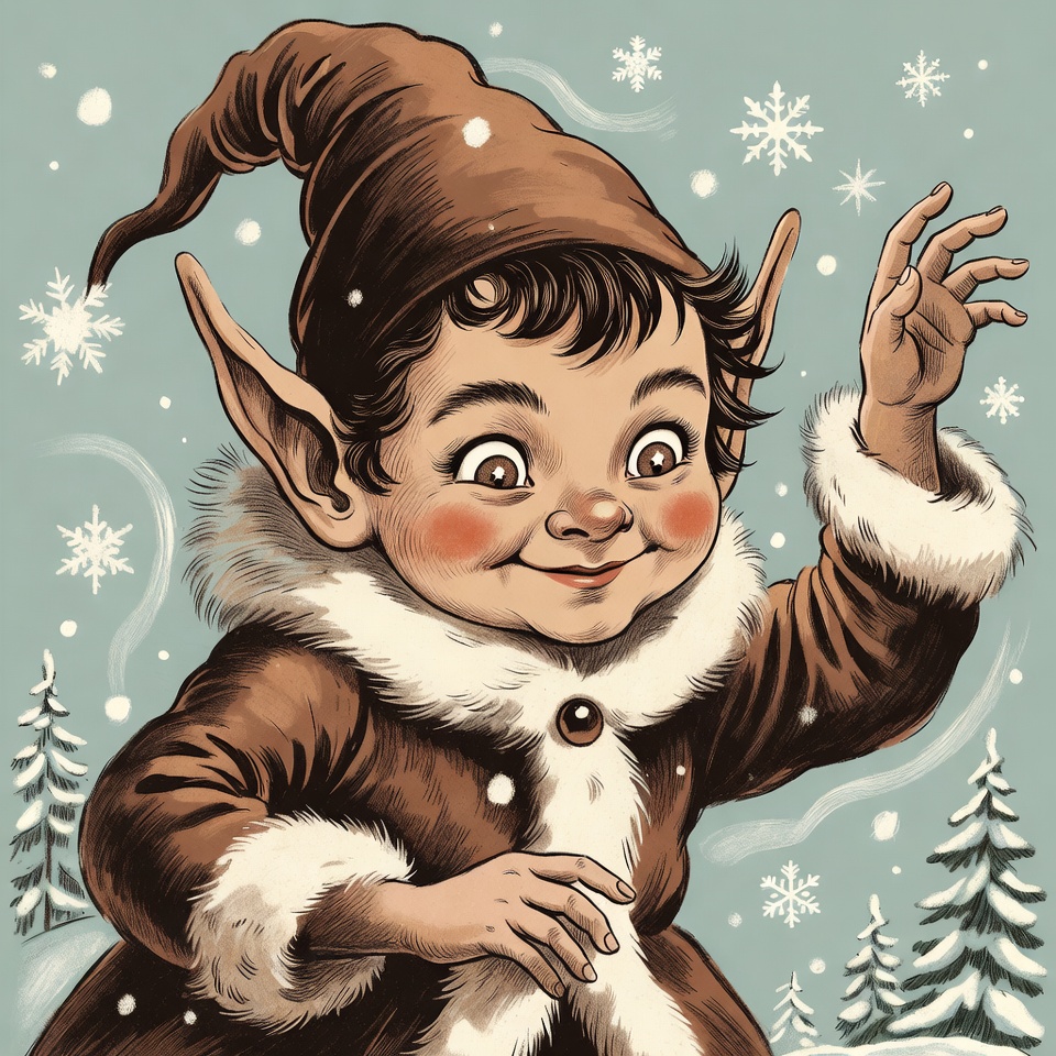A cheerful cartoon elf with pointy ears, brown curly hair, and rosy cheeks waves one hand while holding the other near its face. The elf wears a brown hooded coat with white fur trim and a matching hat, set against a snowy blue background with falling snowflakes and pine trees. The illustration features a vintage, hand-drawn style with vibrant colors.