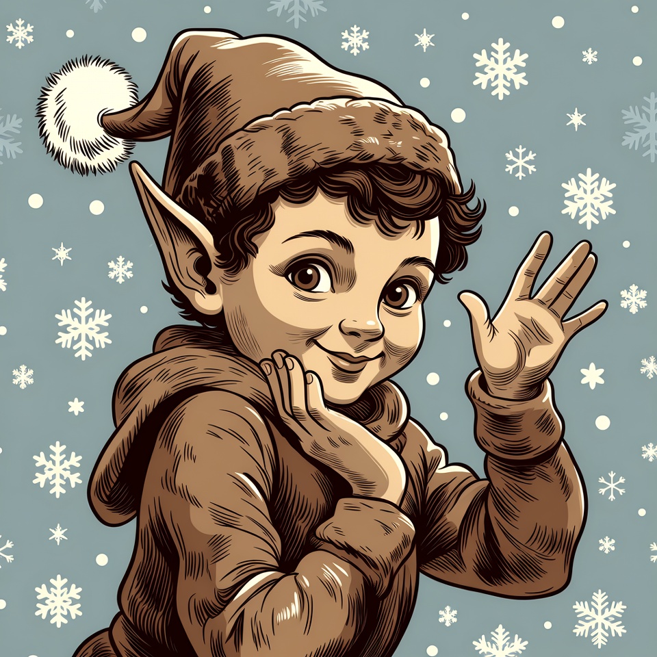 A cute cartoon elf with pointy ears, curly brown hair, and a brown hat with white pom-pom waves happily with both hands. He wears a brown hooded robe and smiles on a light blue background scattered with white snowflakes. The illustration features a hand-drawn, linocut-style design.