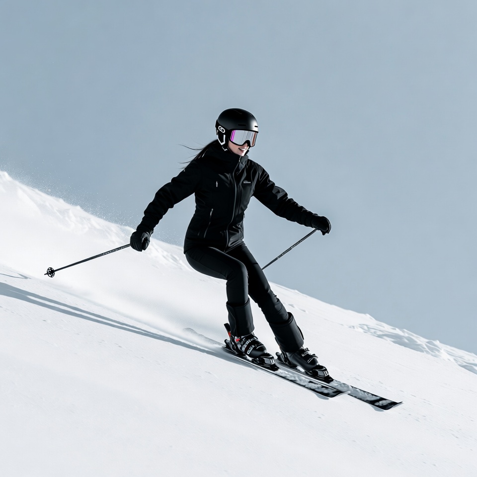 A woman in a black ski jacket, pants, helmet, and goggles skis down a snowy mountain slope. She holds black ski poles and wears sturdy ski boots attached to black skis. The background features white snow and a clear blue sky.