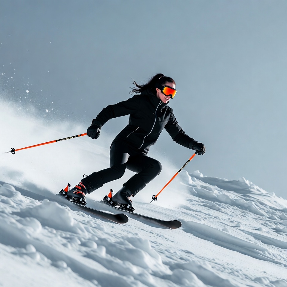 A woman with ponytail hair skis dynamically down a snowy mountain slope, kicking up powder snow. She wears a black jacket, pants, orange goggles, and holds orange ski poles. Her red ski boots are attached to black skis as she leans into the turn.