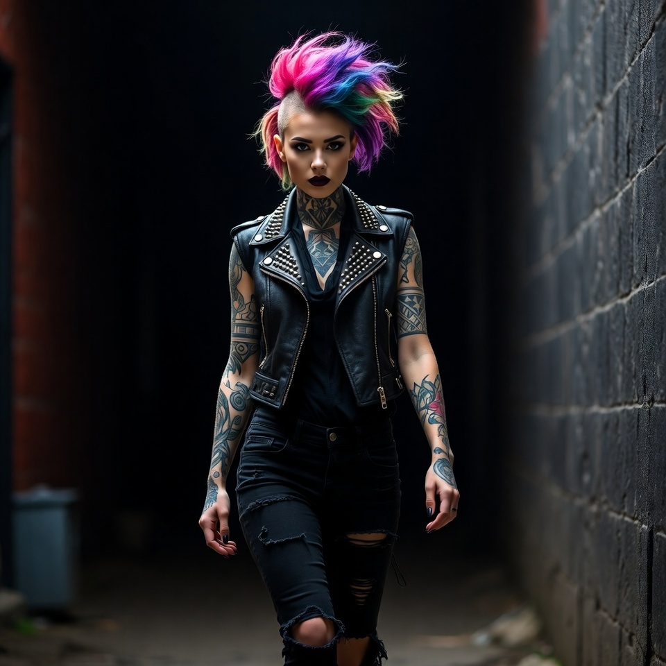 A woman with a vibrant pink and purple mohawk hairstyle stands in a dark brick alley. She wears a black leather jacket with studs, black tank top, ripped jeans, and has extensive tattoos on her arms and neck. Her makeup features dark lips, and she poses confidently with hands at her sides.