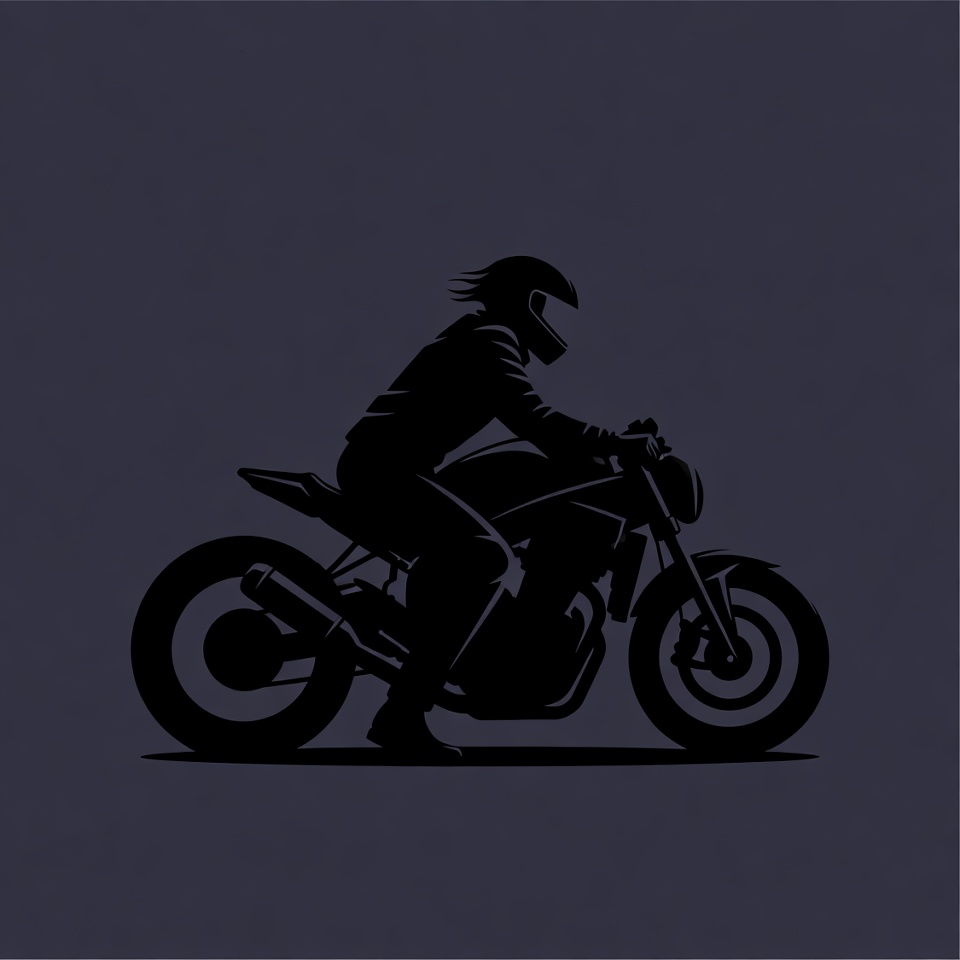 A black silhouette illustration depicts a woman riding a sport motorcycle on a dark gradient background. She wears a helmet with flowing hair, leather jacket, and pants while gripping the handlebars. The motorcycle features a sleek design with visible exhaust and wheels.