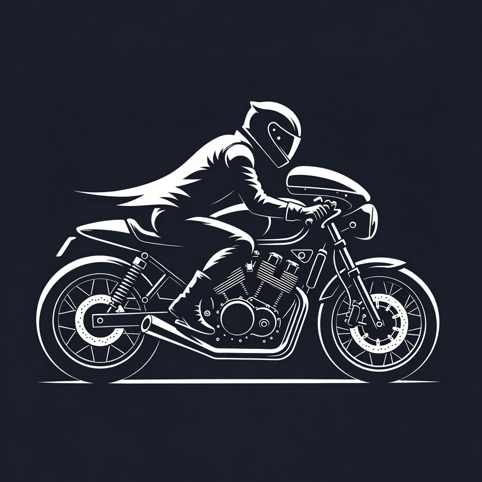 A stylized line art illustration depicts a man in a helmet and long coat riding a classic motorcycle. The rider leans forward dynamically with motion lines trailing behind. The image features a dark background and white outlines for a striking vector graphic effect.