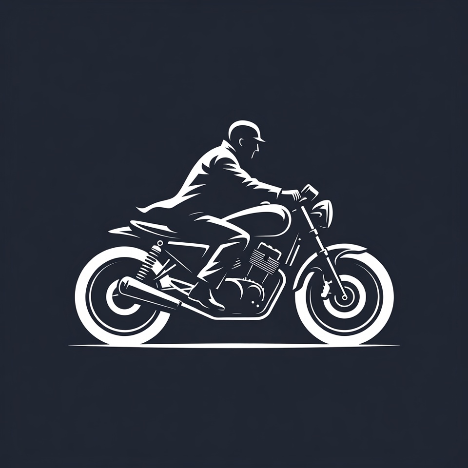 A white silhouette illustration of a man riding a classic motorcycle on a dark background. The man wears a coat and helmet while gripping the handlebars. The motorcycle features round headlights, exposed engine, and detailed wheels.