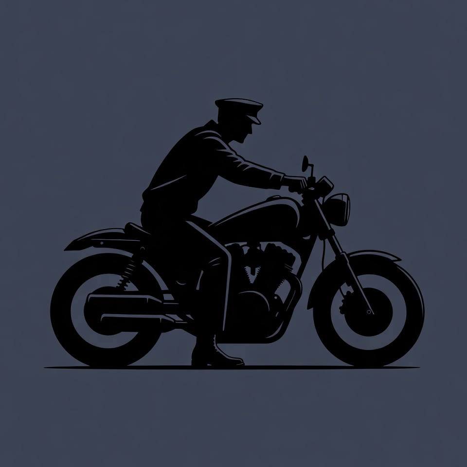 A black silhouette illustration depicts a policeman in uniform and peaked cap riding a motorcycle. He leans forward while gripping the handlebars, with the motorcycle featuring a round headlight, exposed engine, and large wheels. The image is set against a solid dark blue background.