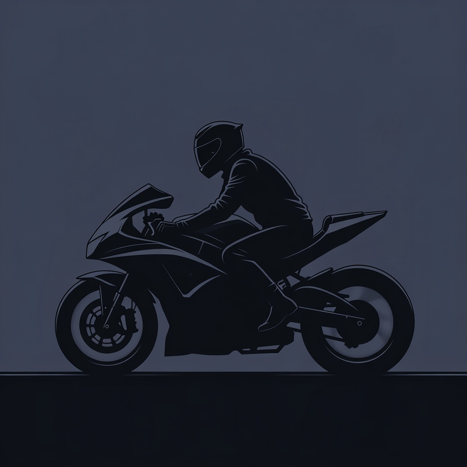 A black silhouette illustration depicts a man in a full-face helmet and leather jacket riding a sport motorcycle. He leans forward in a dynamic riding pose on an isolated dark background. The motorcycle features a sleek fairing, visible exhaust, and rear wheel.