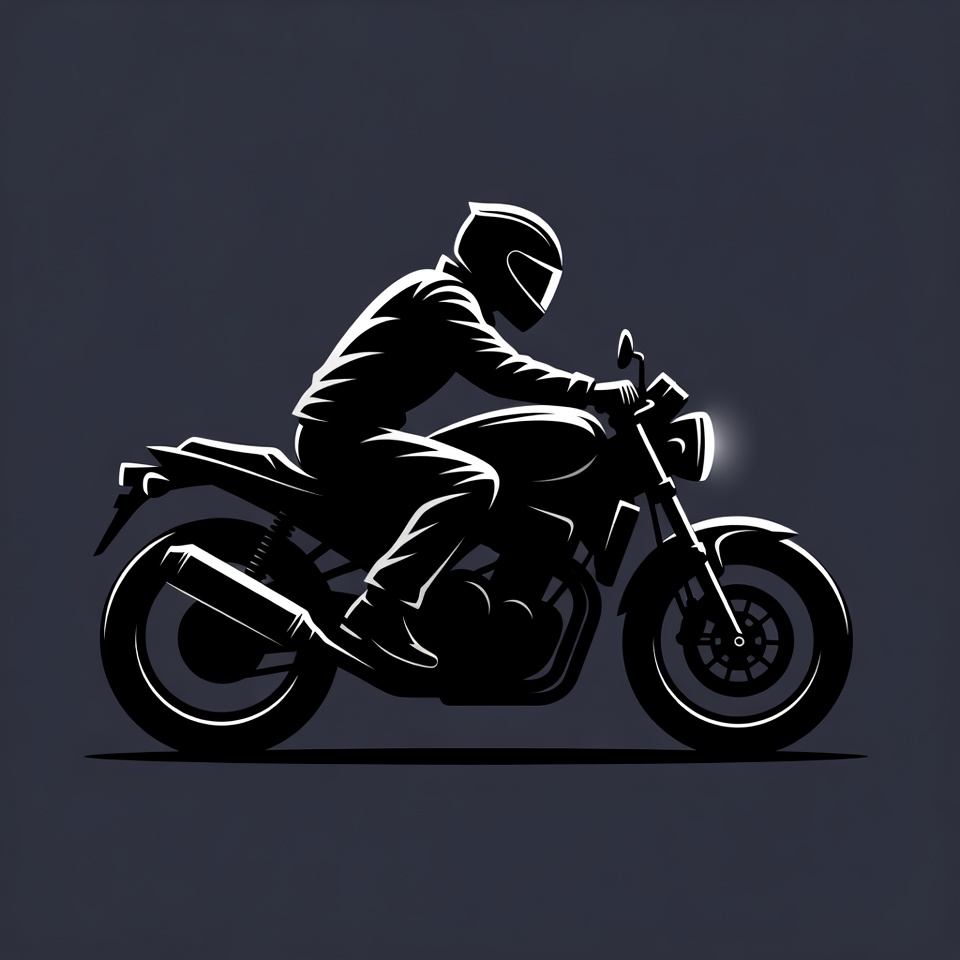 A black silhouette illustration depicts a man riding a motorcycle in profile view. He wears a helmet, leather jacket, and pants while gripping the handlebars. The image features a classic motorcycle with visible exhaust, wheels, and headlight on a dark background.
