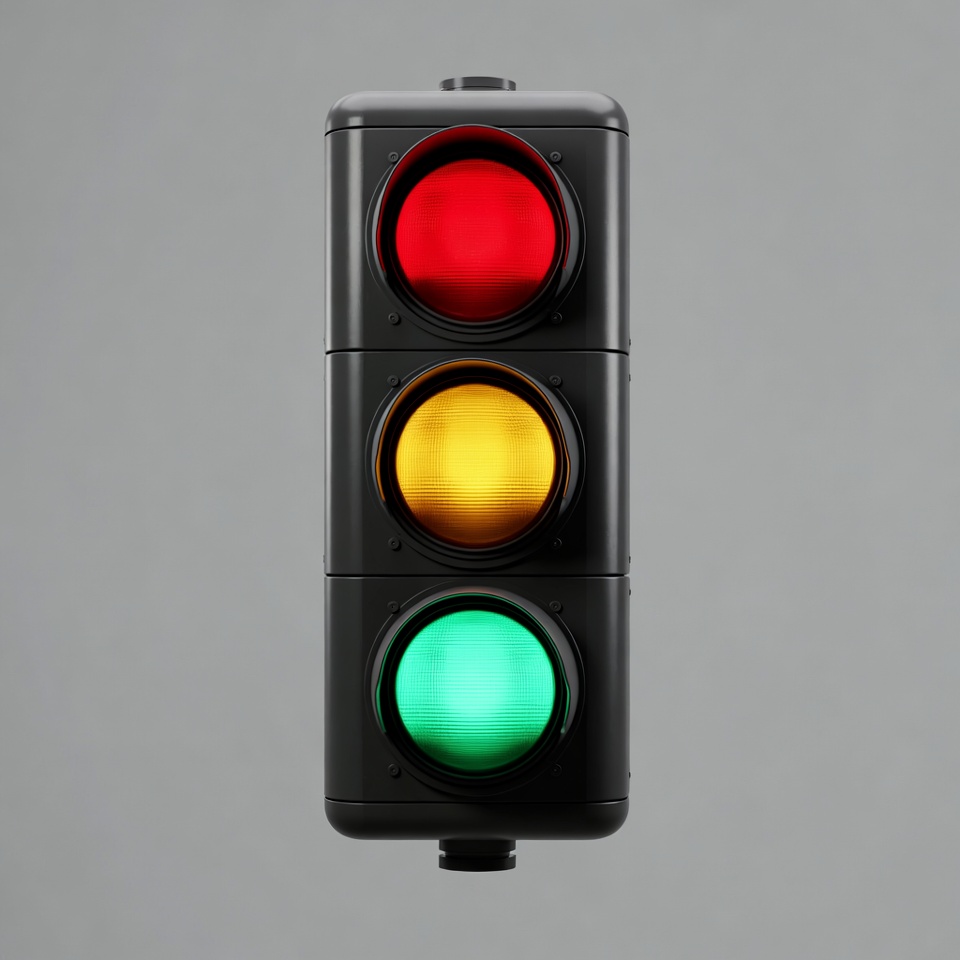 A three-light traffic signal stands against a plain gray background. The top light glows red, the middle light glows yellow, and the bottom light glows green. The black housing frames the illuminated circular lenses.