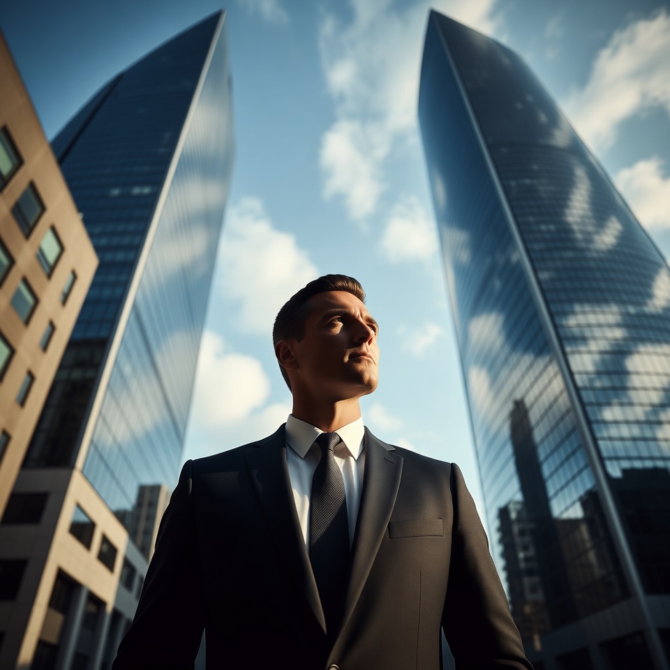 A young man in a black suit and white shirt stands in an urban street, looking upward at towering modern skyscrapers. The glass buildings reflect the blue sky and clouds during daytime. He has short dark hair and a serious expression.