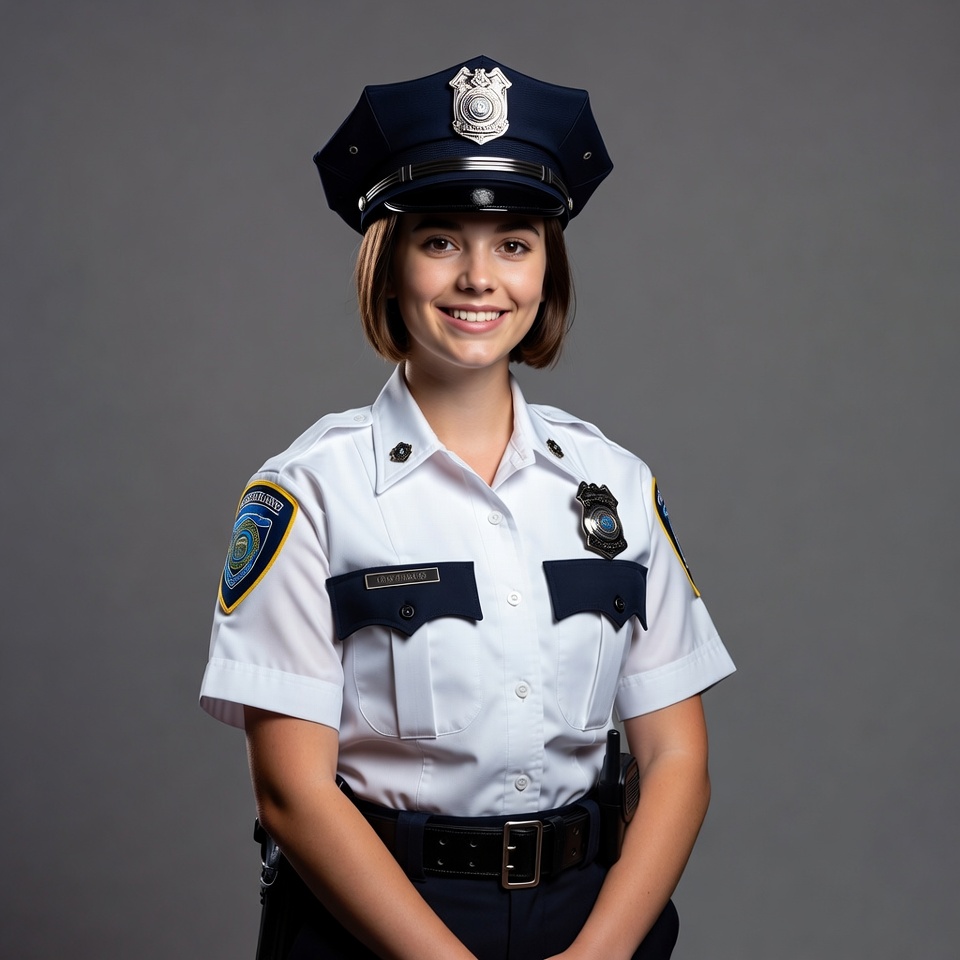 brown hair, female officer, gray background, law enforcement, navy hat, police badge, police hat, police officer, police patch, police uniform, short hair, smiling, white shirt, woman, young woman, police woman