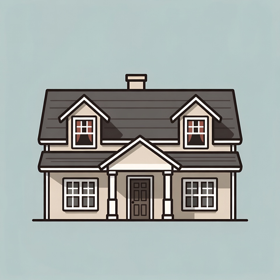 A simple line art illustration of a two-story house features a gabled roof, dormer windows, and a front porch with columns. The house has beige walls, dark gray shingles, red curtains in the upper windows, and white window frames. It stands isolated on a light blue background.