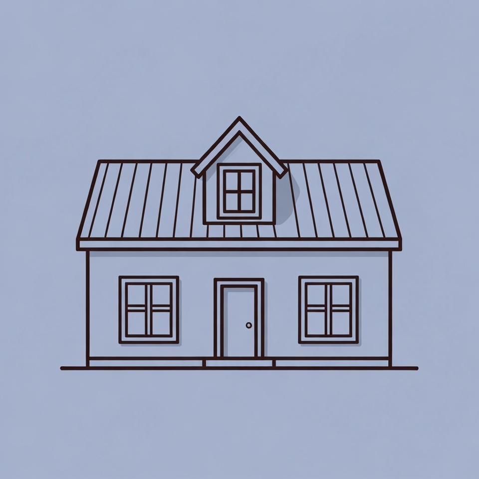 A simple line illustration of a house features a steep gabled roof with a dormer window and metal roofing. The facade includes a central front door flanked by two windows with shutters. The house stands isolated on a solid light blue background.
