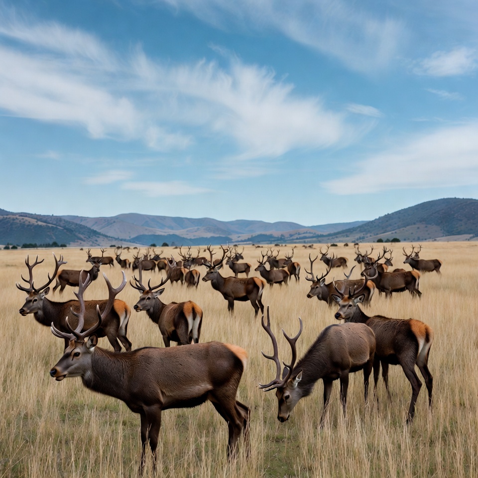 animals, antlers, autumn grass, blue sky, brown deer, clouds, deer, european deer, field, forest deer, golden grass, grassy field, grazing deer, herd, landscape, male deer, mammal, meadow, mountains, nature, outdoors, savanna, ungulate, wild animals, wildlife, red deer