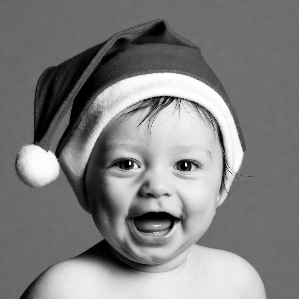 Christmas hat, Santa hat, black and white, boy, child, girl, gray background, happy baby, infant, portrait, red hat, smiling, tongue out, wet hair, white pom-pom, baby