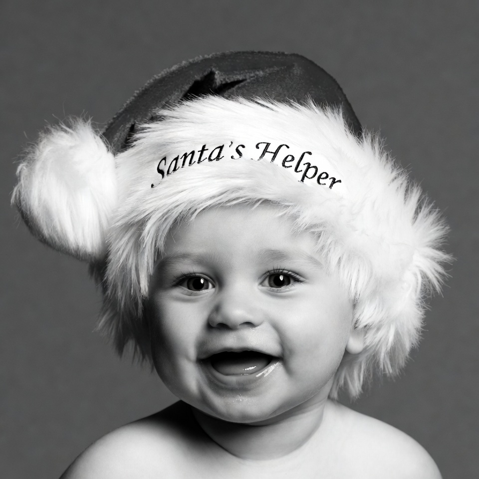 A smiling baby with fair skin and big eyes wears a fluffy red Santa hat labeled 'Santa's Helper'. The hat has white fur trim and a large pom-pom. The baby is shown from the chest up against a gray background.
