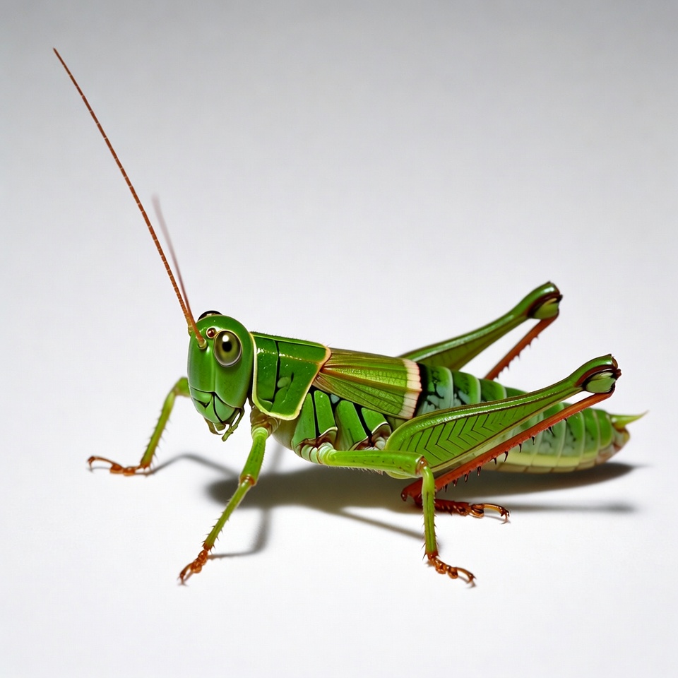 A vibrant green grasshopper stands on a plain white background. It features long red antennae, large eyes, and detailed wings with green and yellow patterns. Its legs are positioned as if ready to jump.