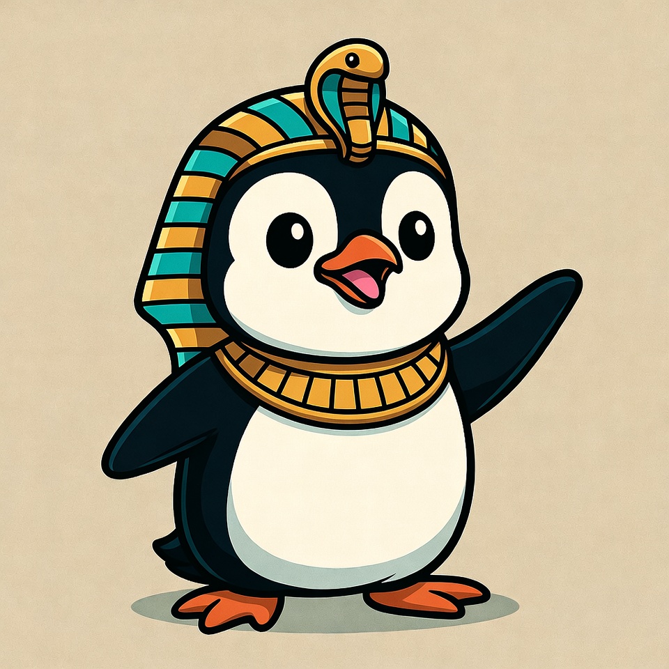 A chibi-style cartoon penguin wears a blue and gold striped pharaoh headdress with a cobra and necklace. The adorable black and white penguin has big eyes, an open beak, and raises one flipper in a waving gesture. It stands on orange feet against a beige isolated background.