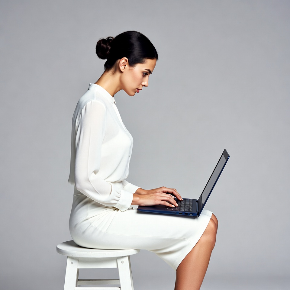 A woman with dark hair in a bun sits on a white stool, typing on a laptop. She wears a white blouse and skirt, viewed from the side against a gray background. Her posture is upright as she focuses on the screen.