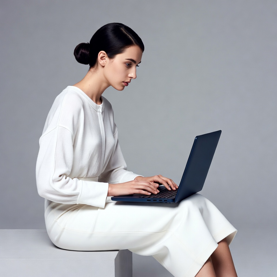 A woman with dark hair in a bun sits on a white stool wearing a white sweater and skirt. She types on a blue laptop positioned on her lap against a gray background. Her profile view shows concentration as she works.