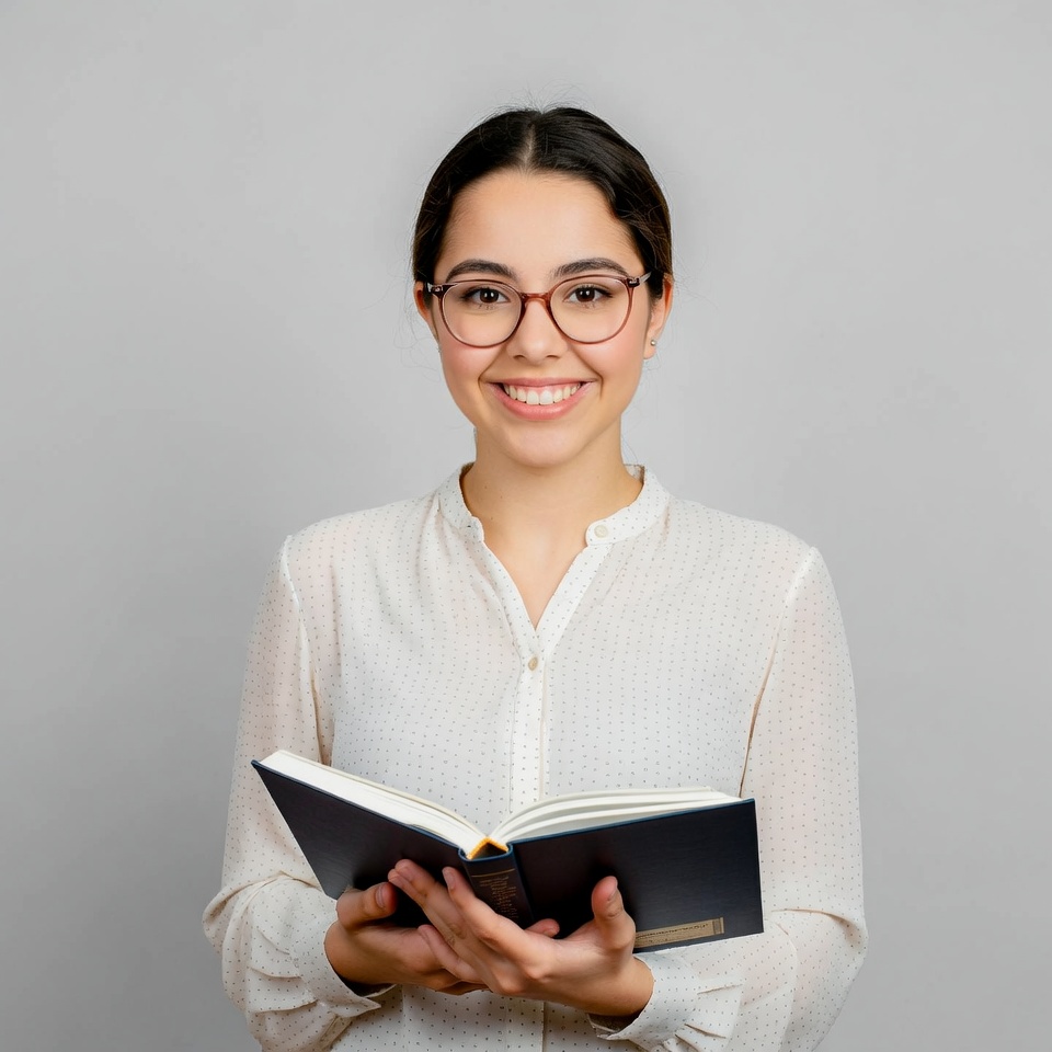 A young woman with dark hair tied back and wearing glasses smiles while holding an open black book in front of her. She is dressed in a white collared blouse with long sleeves. She stands against a plain gray background.
