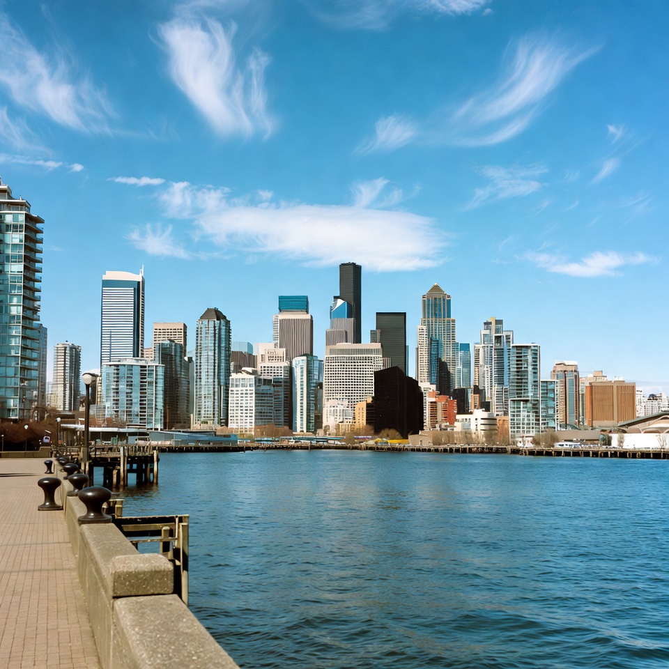 A vibrant Seattle skyline features tall modern skyscrapers reflecting against a clear blue sky with scattered white clouds. The view is from a waterfront pier with calm blue water in the foreground and concrete walkways along the shore. High-rise buildings in glass and steel dominate the horizon.