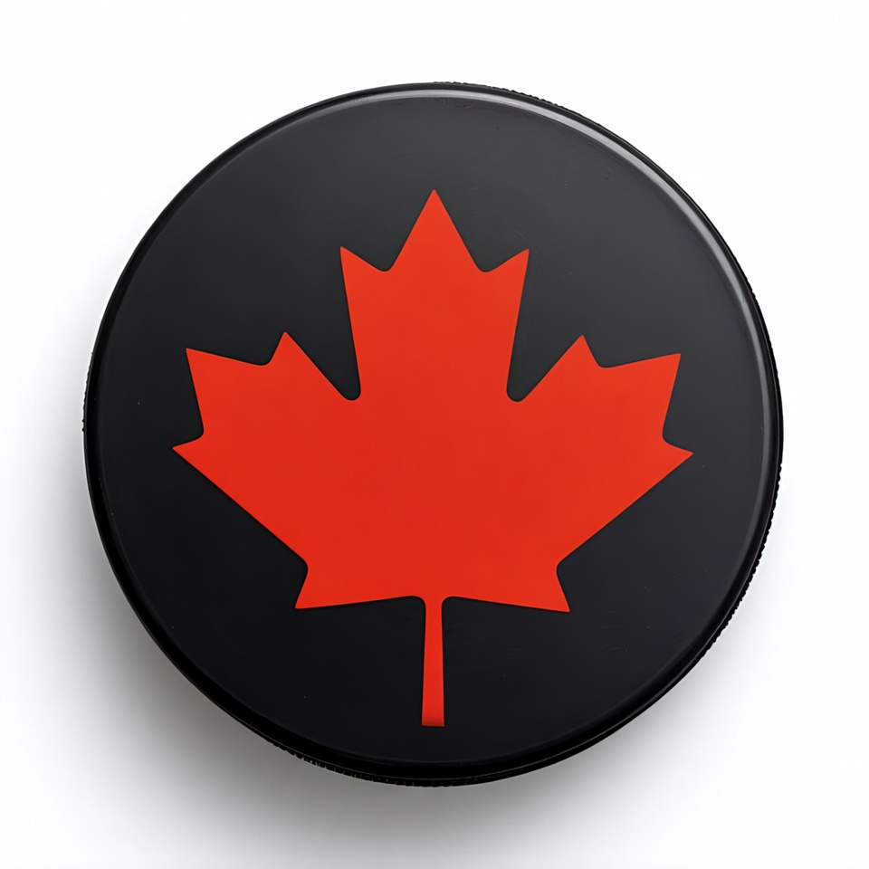 Canada, Canadian, NHL, black puck, clipart, emblem, ice hockey, illustration, isolated background, maple leaf, red leaf, round puck, sports equipment, symbol, hockey puck