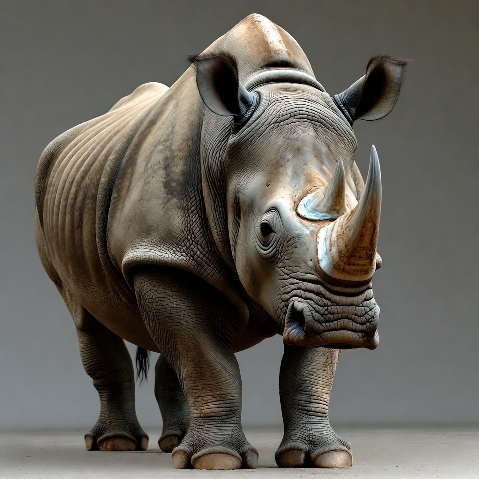 A majestic white rhinoceros stands facing forward on a plain gray background. Its prominent horn, thick wrinkled skin, and sturdy legs are clearly visible. The rhino has a serious expression with small eyes and large ears.